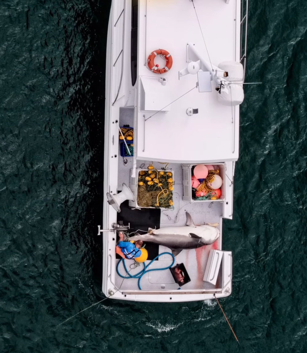Footage has surfaced of a four-metre tiger shark that was caught on a drumline on the southern Gold Coast on Monday.