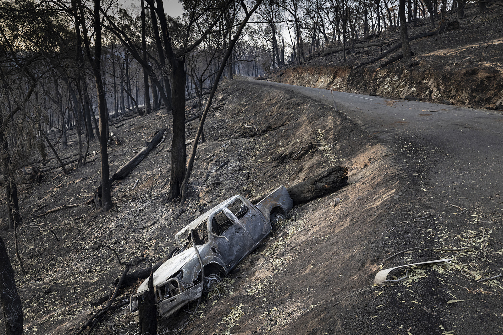 Police said they made the tragic discovery about 100 metres from a vehicle in a town almost completely wiped out by fire.