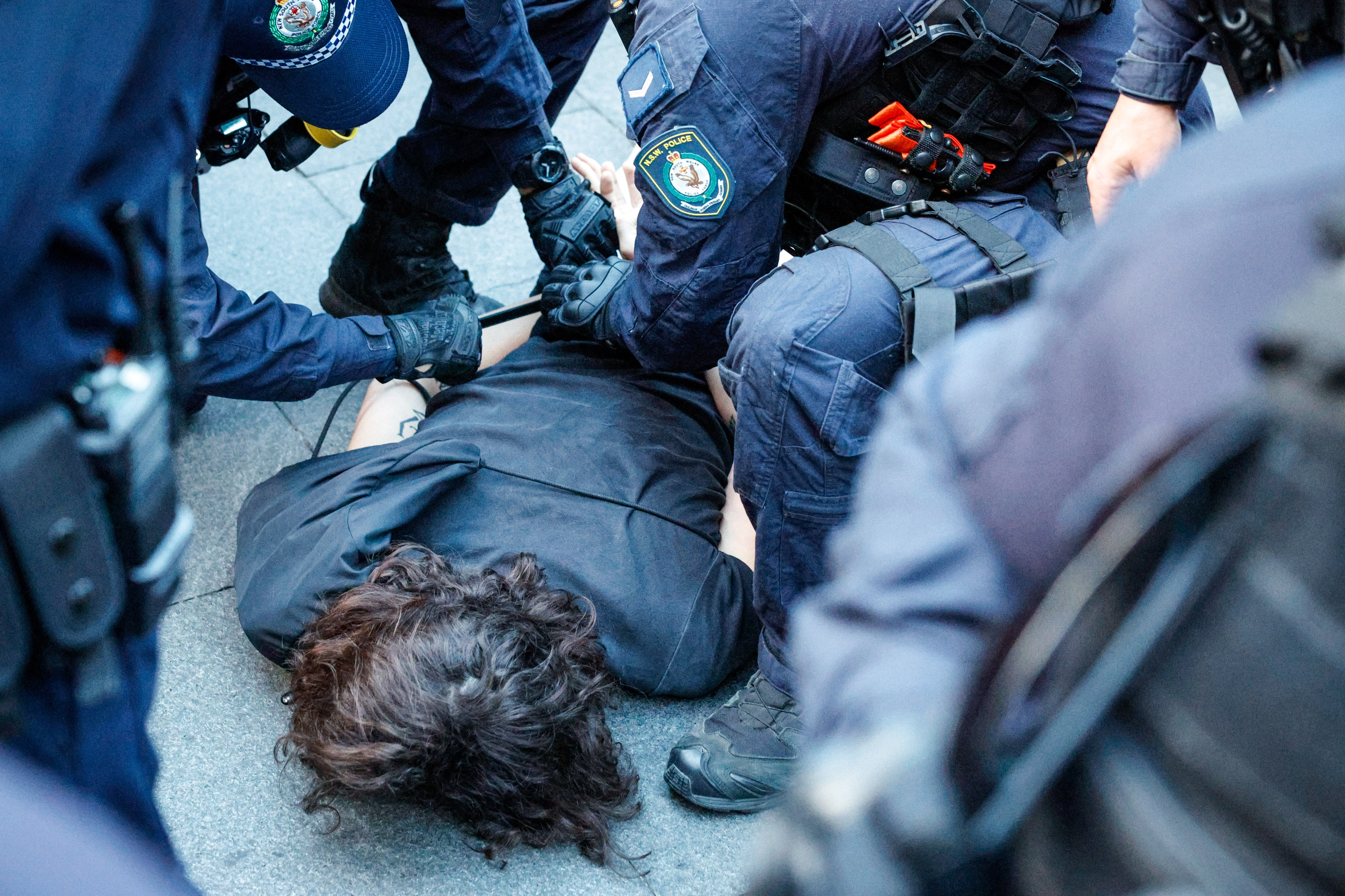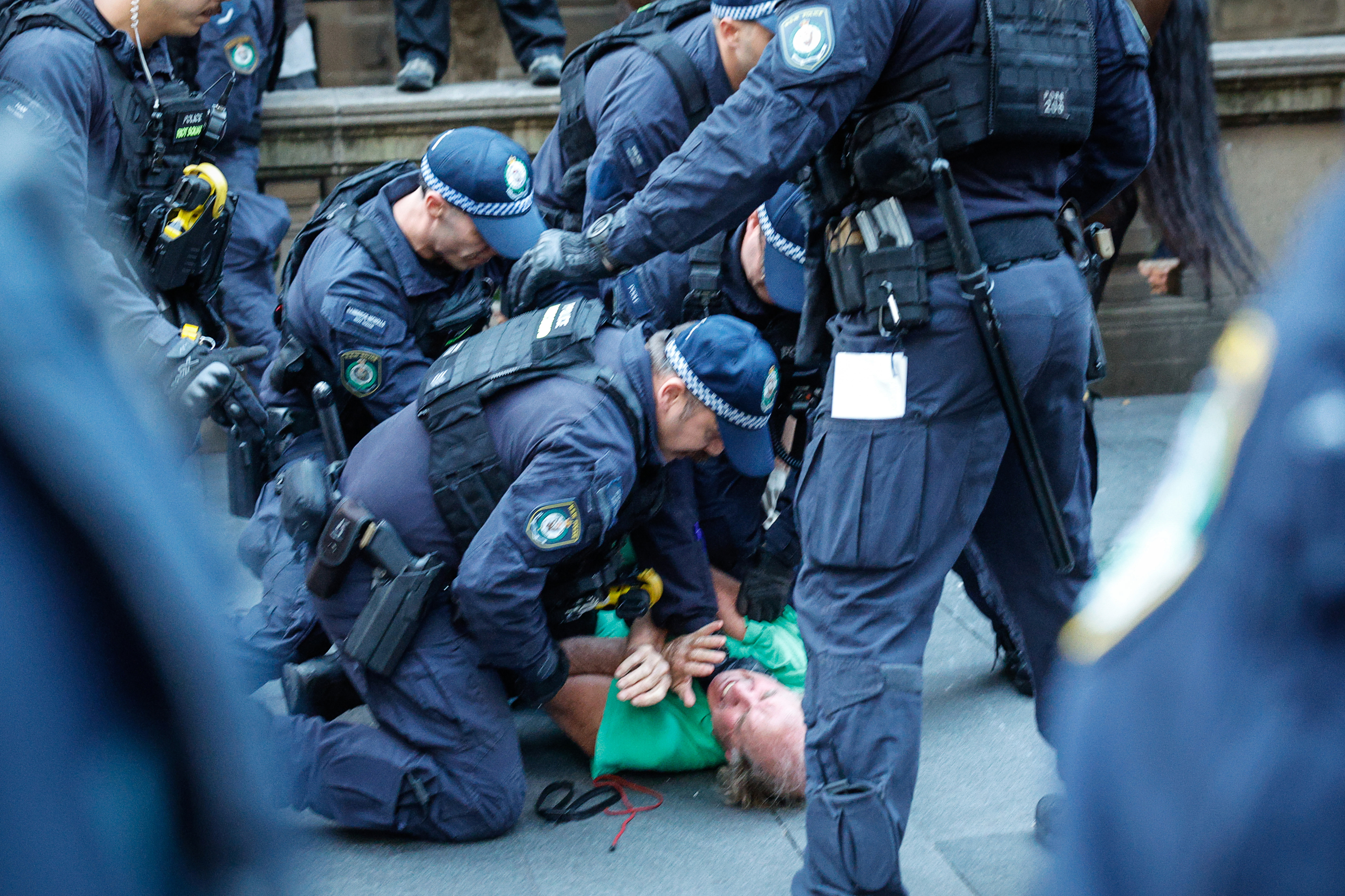Images from the scene show people being pinned to the ground and handcuffed by officers.