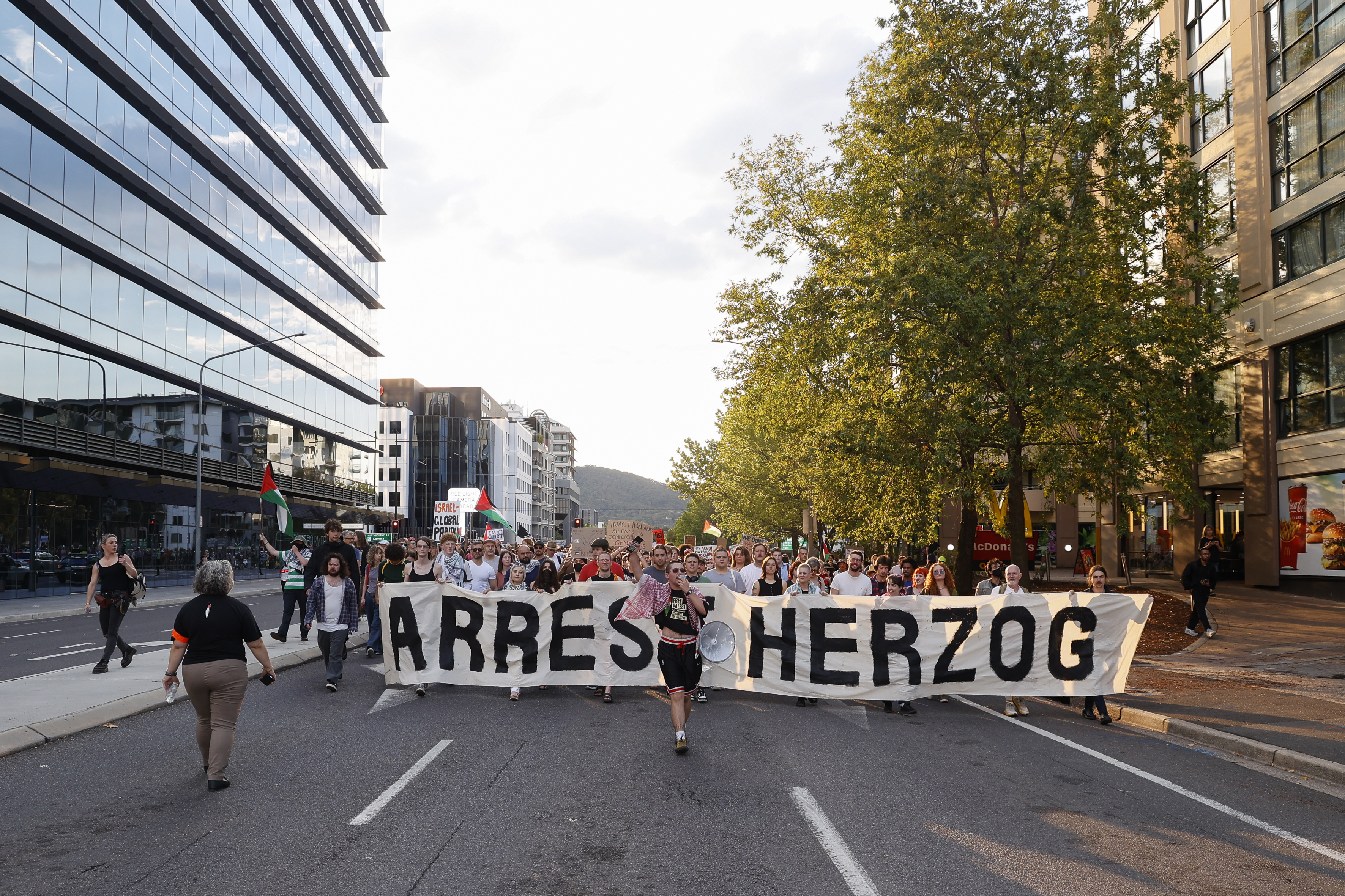 As protesters and police clashed, Herzog was attending a speaking event hosted by the Jewish community at the International Convention Centre on the other side of the CBD.
