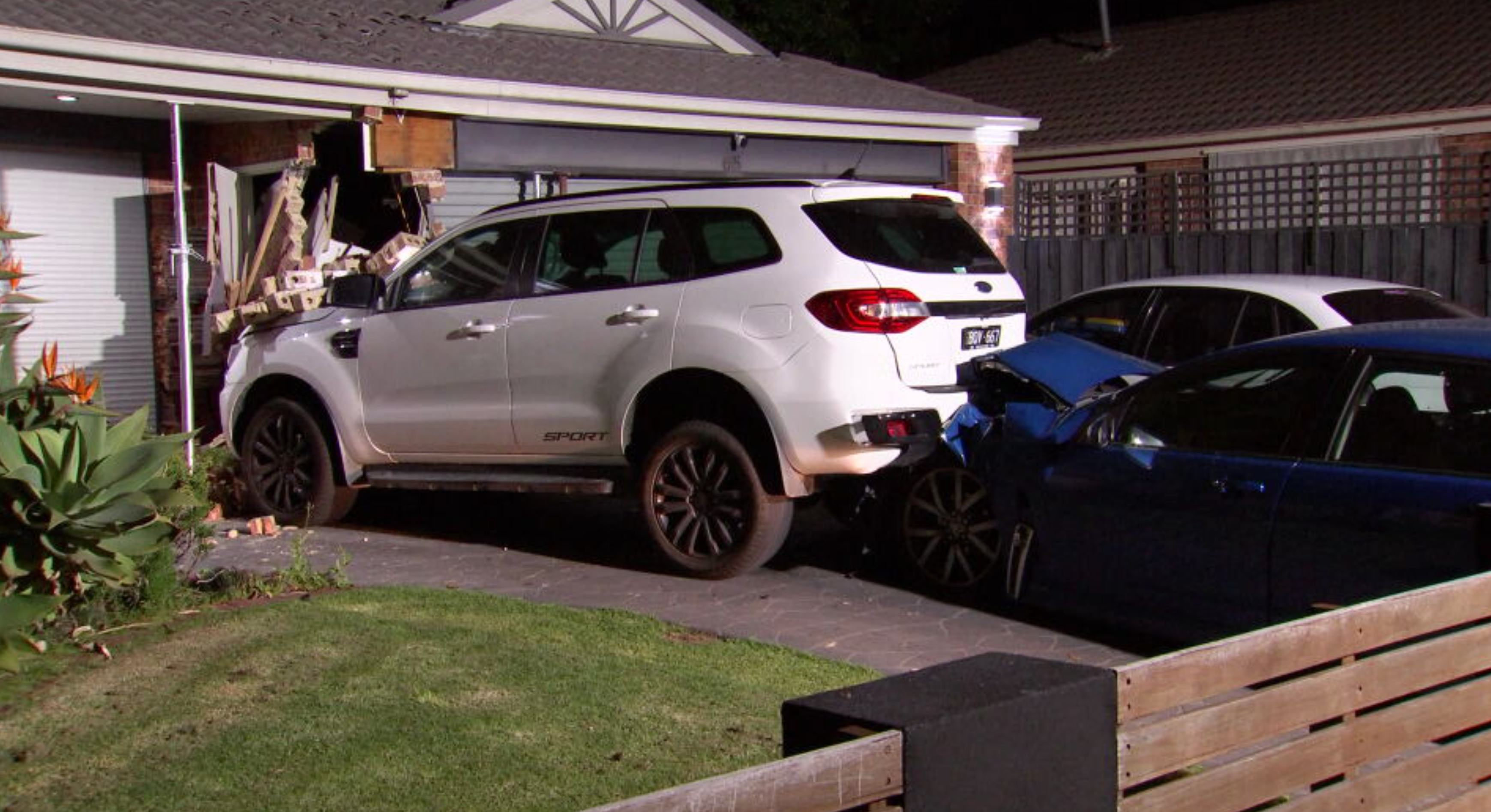 The force of the smash pushed the parked car through the garage of the family home, destroying a brick pillar and causing significant damage to the house's structure, as well as the vehicle.