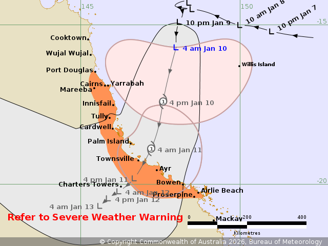 The current warning zone covers Port Douglas to Airlie Beach, including Cairns, Innisfail, Townsville, Bowen, and Proserpine.