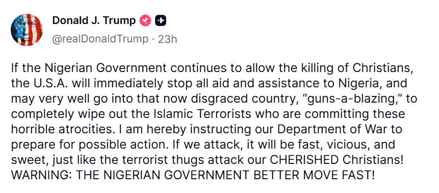 "The killing of innocent Christians in Nigeria – and anywhere – must end immediately. The Department of War is preparing for action. Either the Nigerian Government protects Christians, or we will kill the Islamic Terrorists who are committing these horrible atrocities."