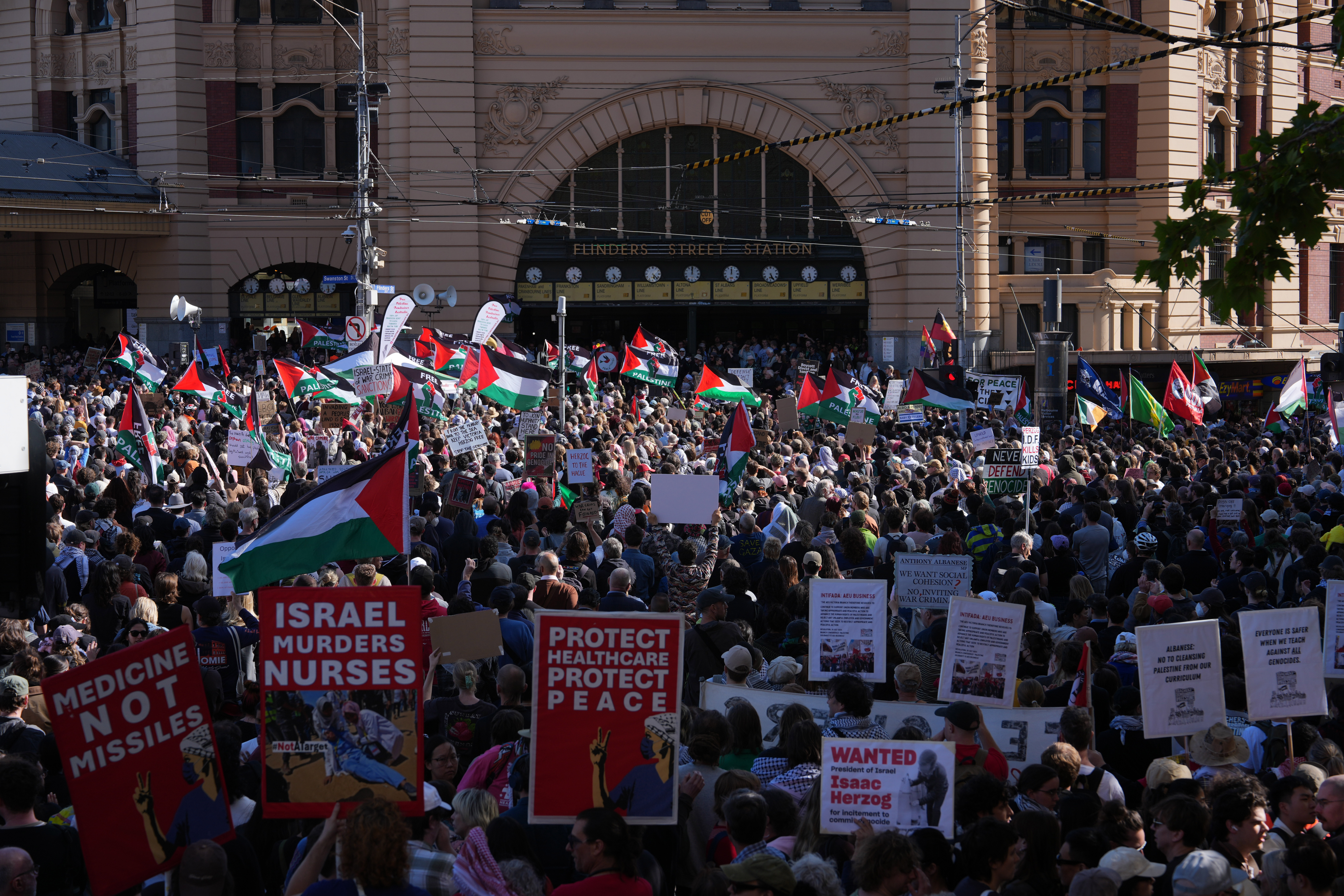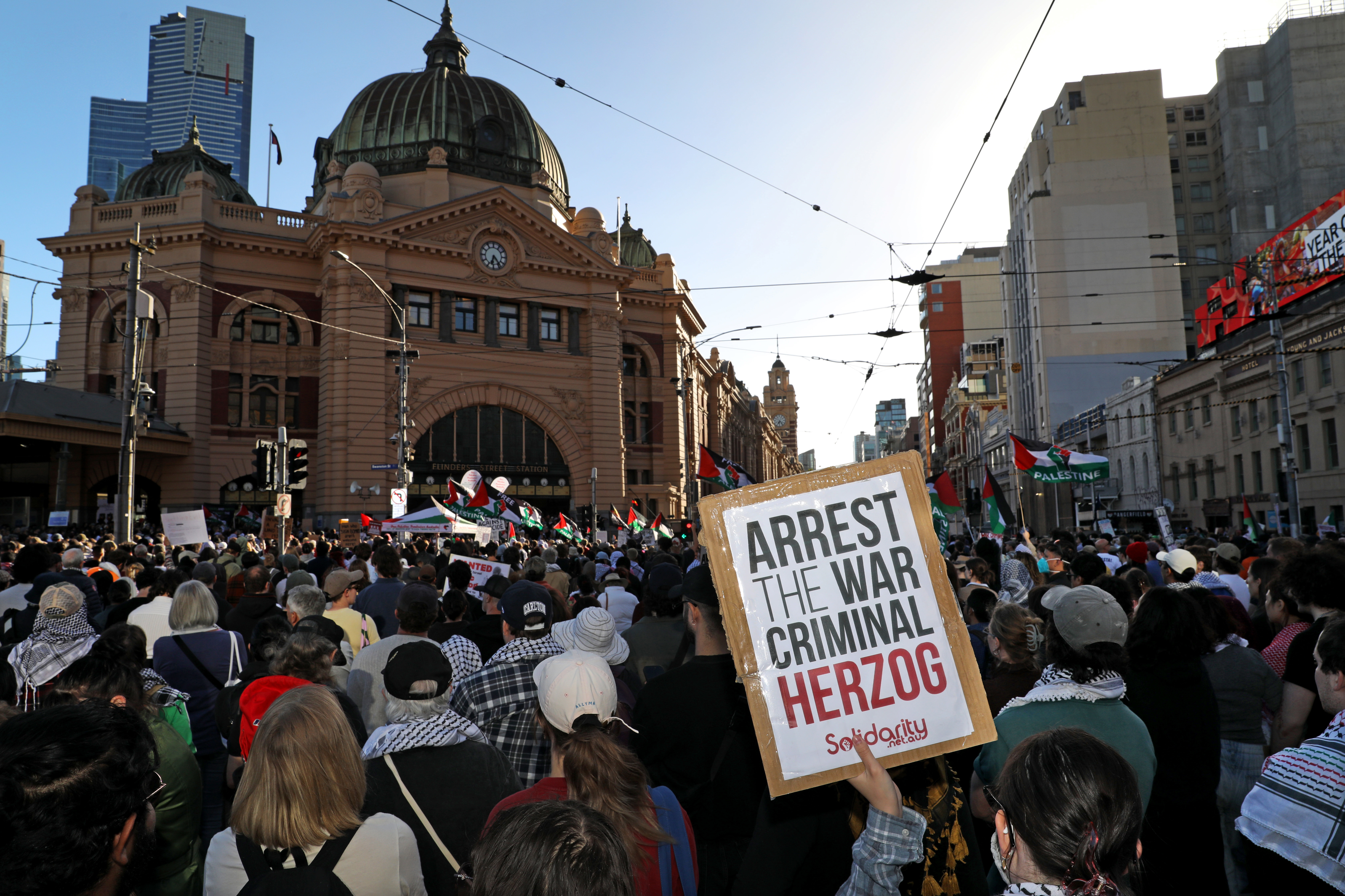 Flinders Street was blocked to trams and traffic as demonstrators marched down Swanston Street to parliament, accusing Herzog of being a war criminal. Victoria Police said about 10,000 people had gathered outside Flinders Street Station whilst organisers put the number at 30,000.
