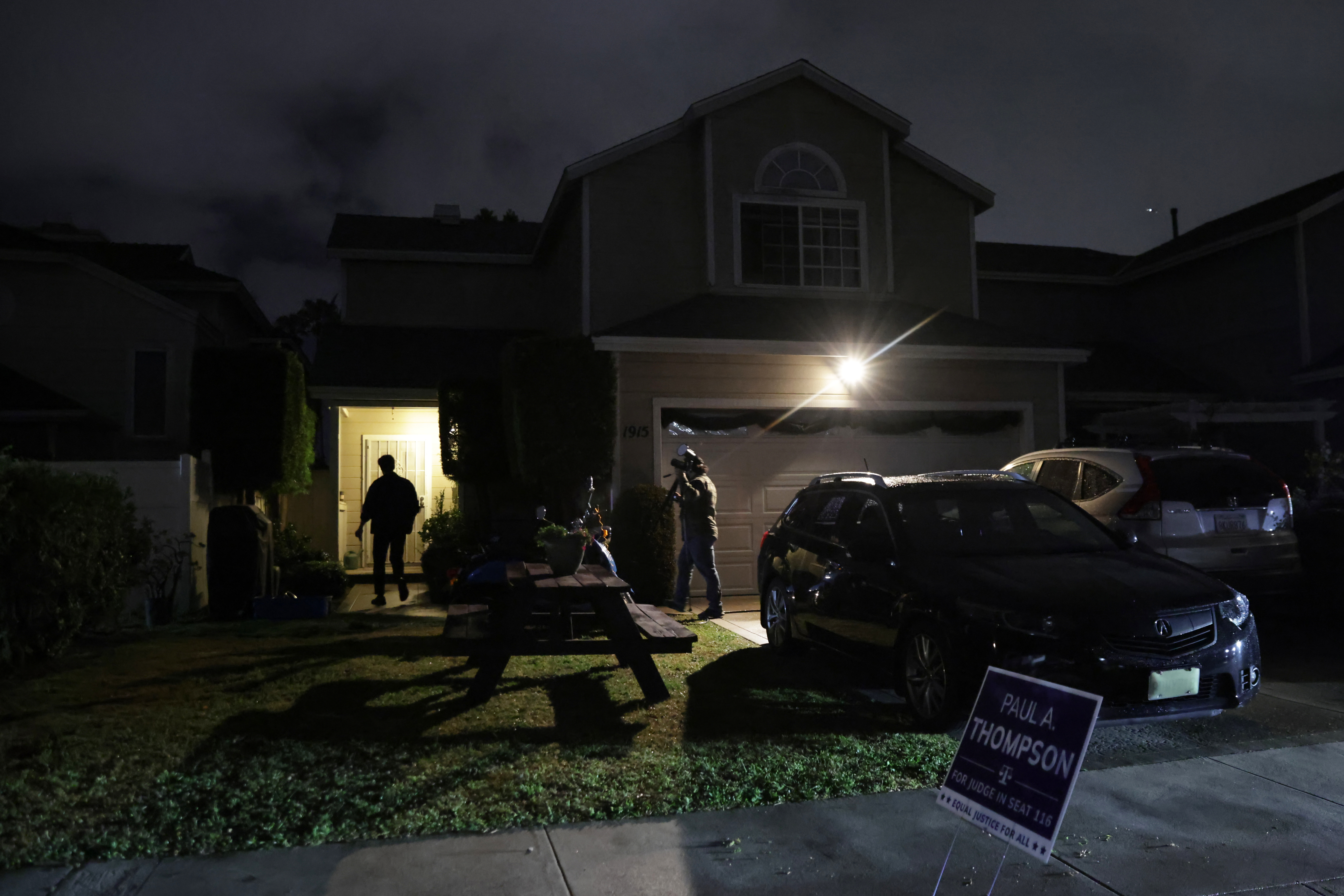 Another photo taken at the scene shows a man covered with a foil blanket on the floor with his hands cuffed, overseen by law enforcement officers.