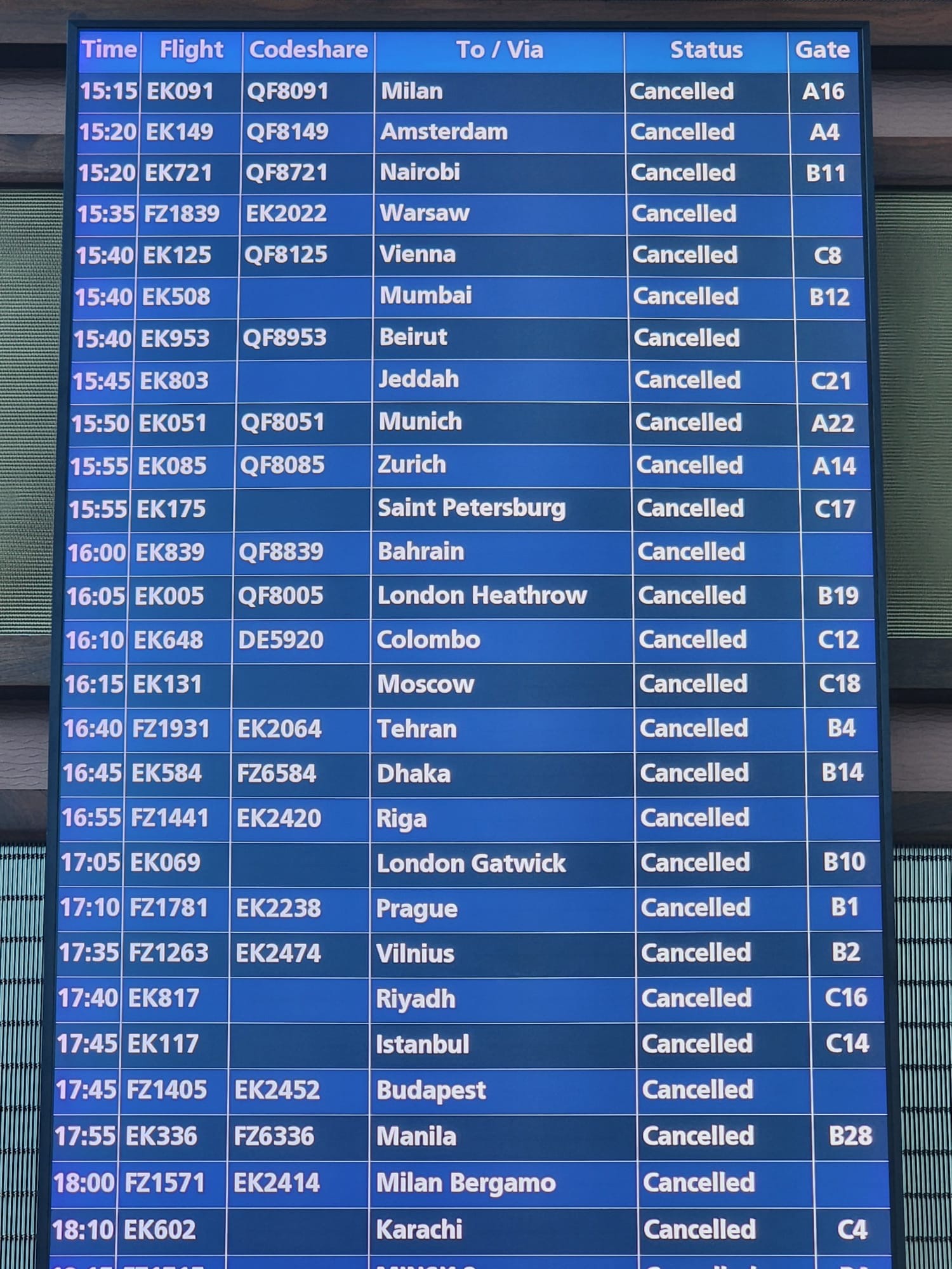 Passengers are advised not to travel to the airport until they have received a confirmed departure time from their airline.