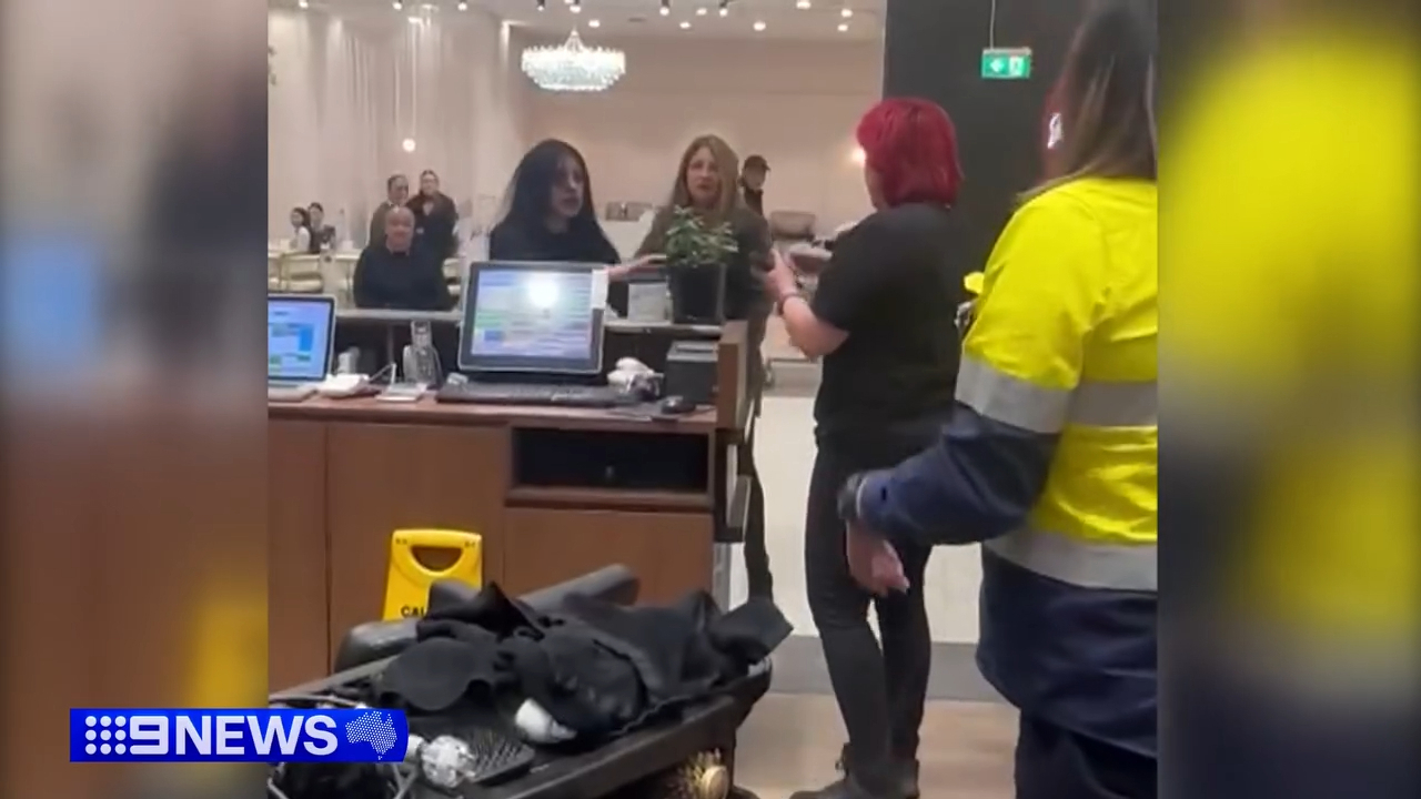 Video of what followed appears to show the 23-year-old yelling and screaming, pulling hair, and even throwing a pot plant.