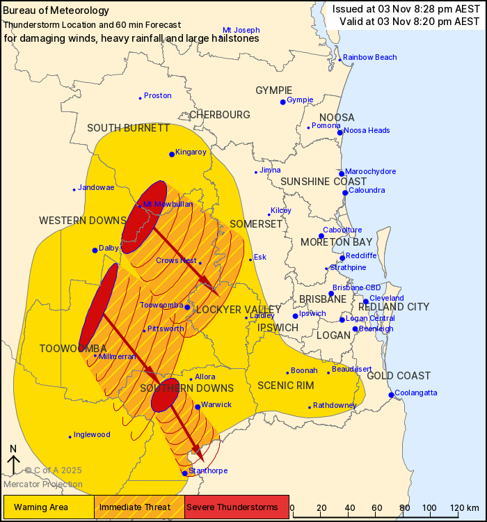 https://twitter.com/BOM_Qld/status/1984886898058293506?ref_src=twsrc%5EtfwAs night fell, the bureau warned a "very dangerous thunderstorm" was west of the Sunshine coast and surging north from Blackbutt towards Nanango.